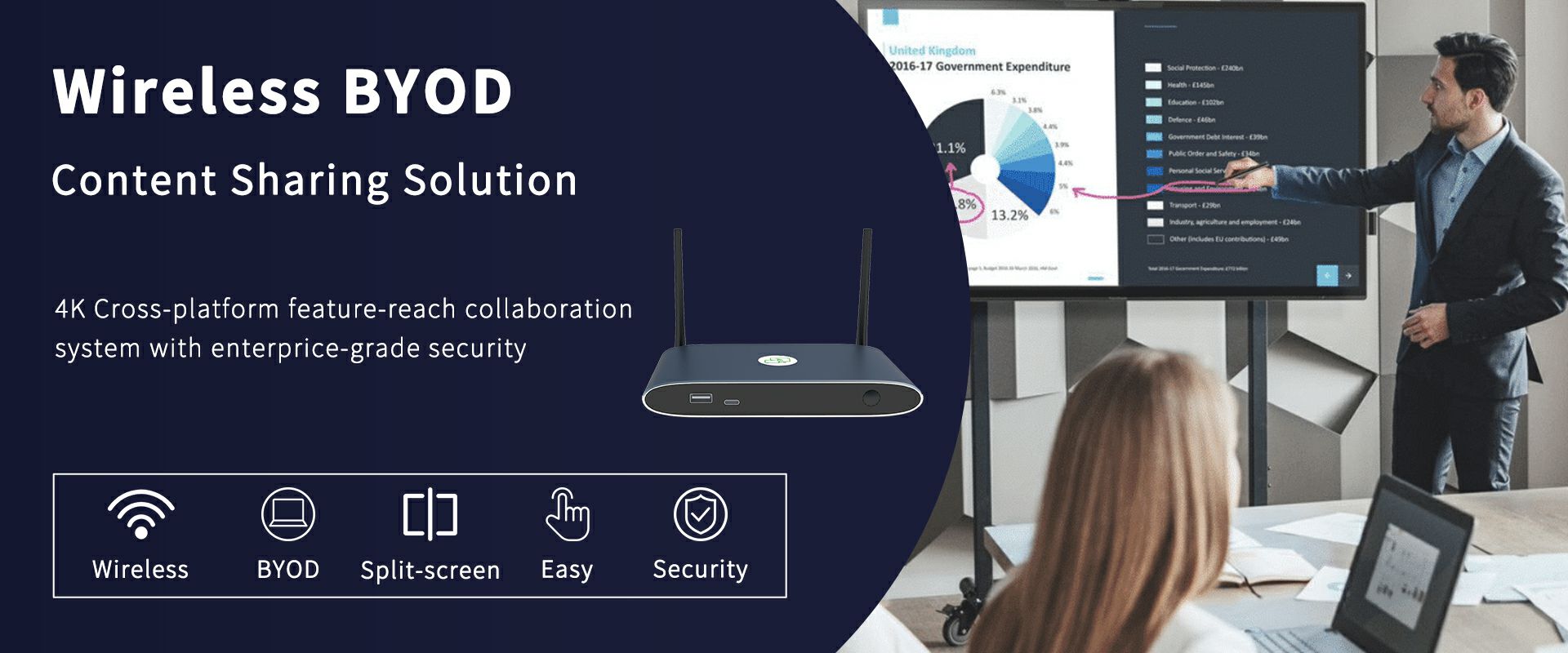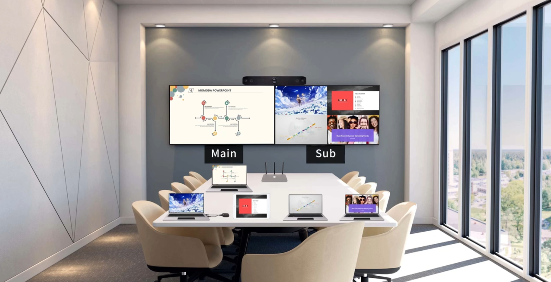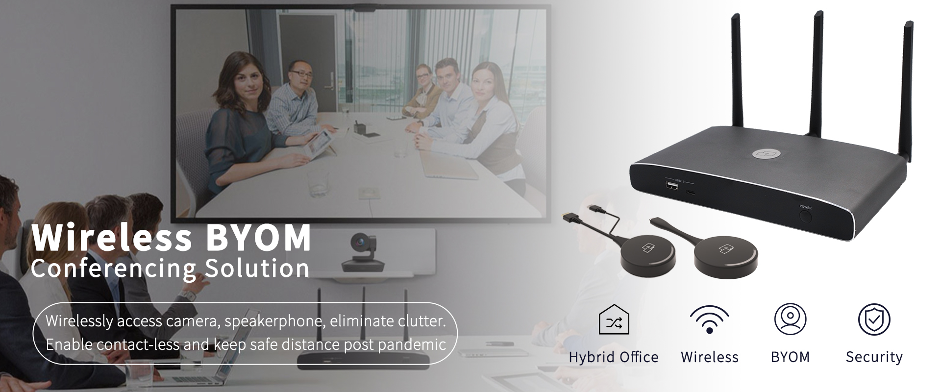 A brand new wireless BYOM conference & collaboration system from Grastron, that provides dual screen collaboration for both local meeting and remote meeting, it can connect with the existing room UC system and connect 2 USB cameras simultaneously and available to switch between them.